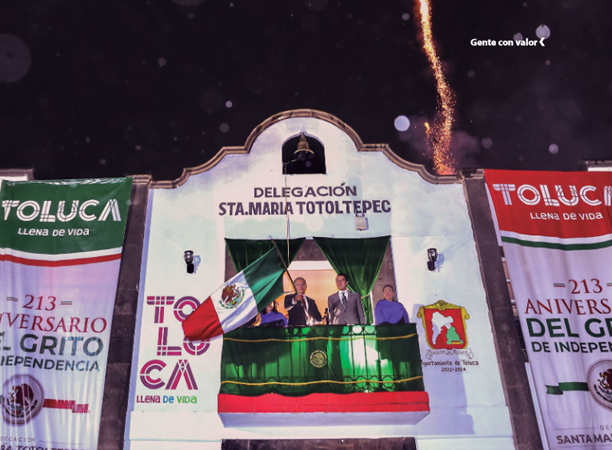 Por la noche del 15 de septiembre, el Alcalde encabezó la celebración del Grito de Independencia en Santa María Totoltepec, un emocionante testimonio del espíritu festivo y el amor a la patria que caracteriza a los toluqueños, pues a pesar de la lluvia, cientos de familias se congregaron en la plaza delegacional para participar en este evento en el que los fuegos artificiales iluminaron el cielo y la música en vivo animó a la multitud.