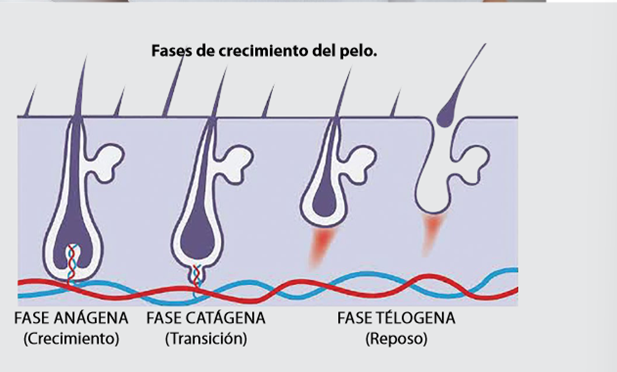 Telógena. Es un período de regresión y muerte del pelo, al que seguirá una nueva fase de crecimiento de un pelo anágeno.