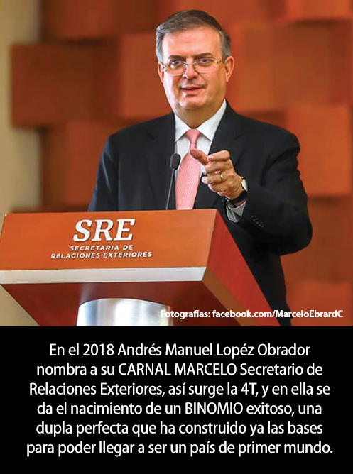 El 1ro de Julio de 2018, Andrés Manuel Lopéz Obrador, gana la presidencia de la República Mexicana con la ayuda de su CARNAL MARCELO, nombrándolo Secretario de Relaciones Exteriores con fecha 1ro de Diciembre de 2018. Así surge la 4T, y en ella se da el nacimiento, yo así lo refiero de un BINOMIO exitoso, una dupla perfecta que ha construido ya las bases para poder llegar a ser un país de primer mundo, al nivel de Estados Unidos y Canadá. No asevero esto como si fuese un amateur o un improvisado ya que Marcelo Ebrard es un experto y así lo refiere el presidente de la república ya que solucionó el tema de las vacunas en tiempos de la Gran Pandemia de Covid 19, negocio con Trump la contención de Migrantes para evitar el aumento de aranceles.